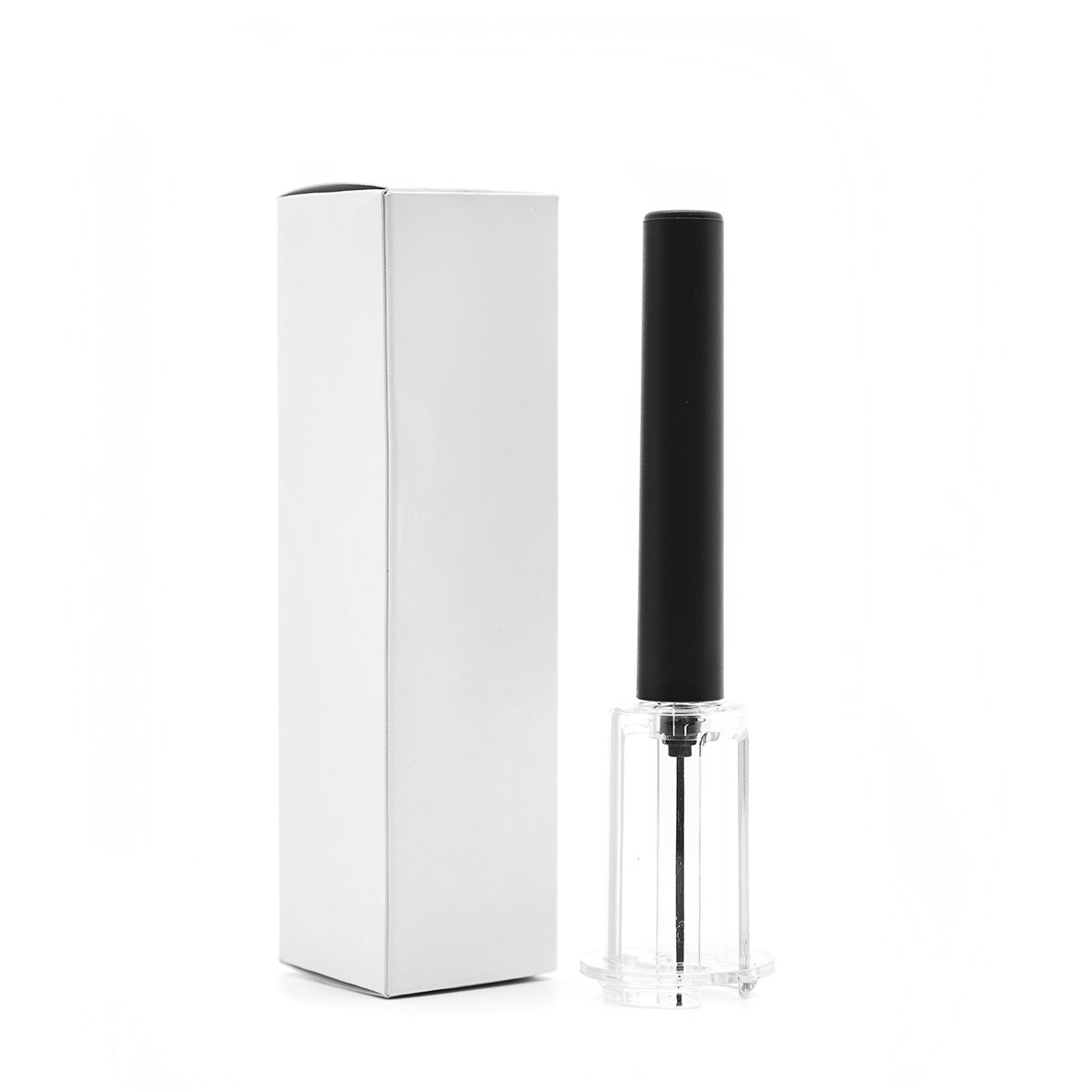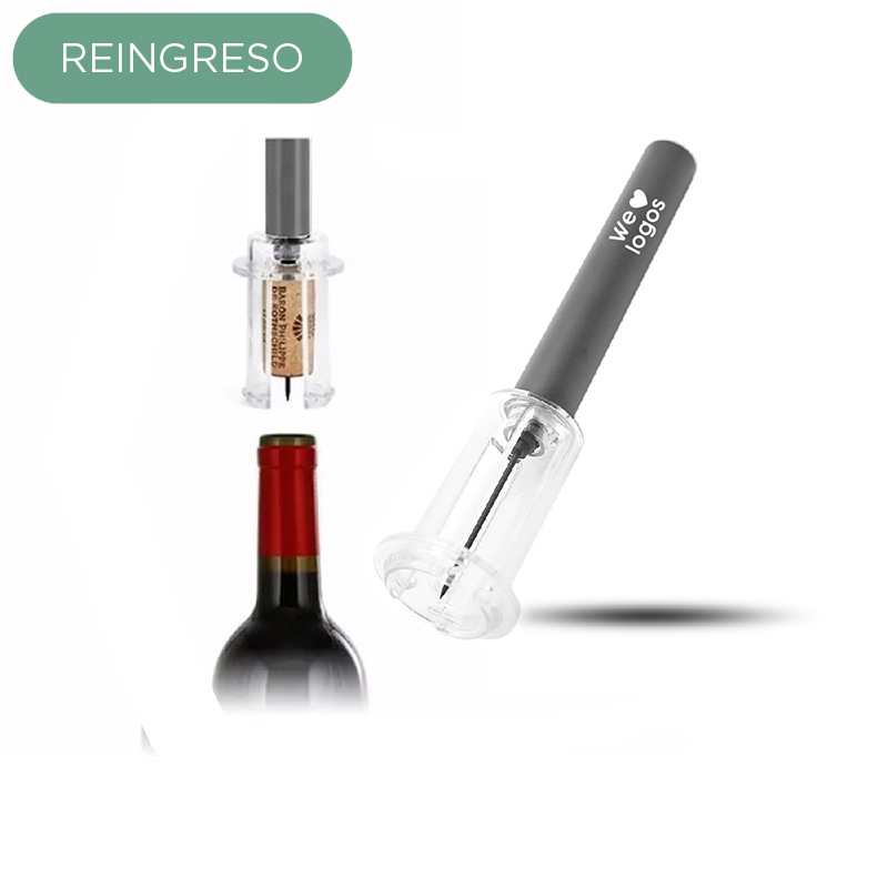 Sacacorchos neumático con caja contenedora. Se clava la aguja al corcho y se da presión al interior de la botella hasta que el corcho sale sin hacer fuerza. Medidas: Largo 19 cm.