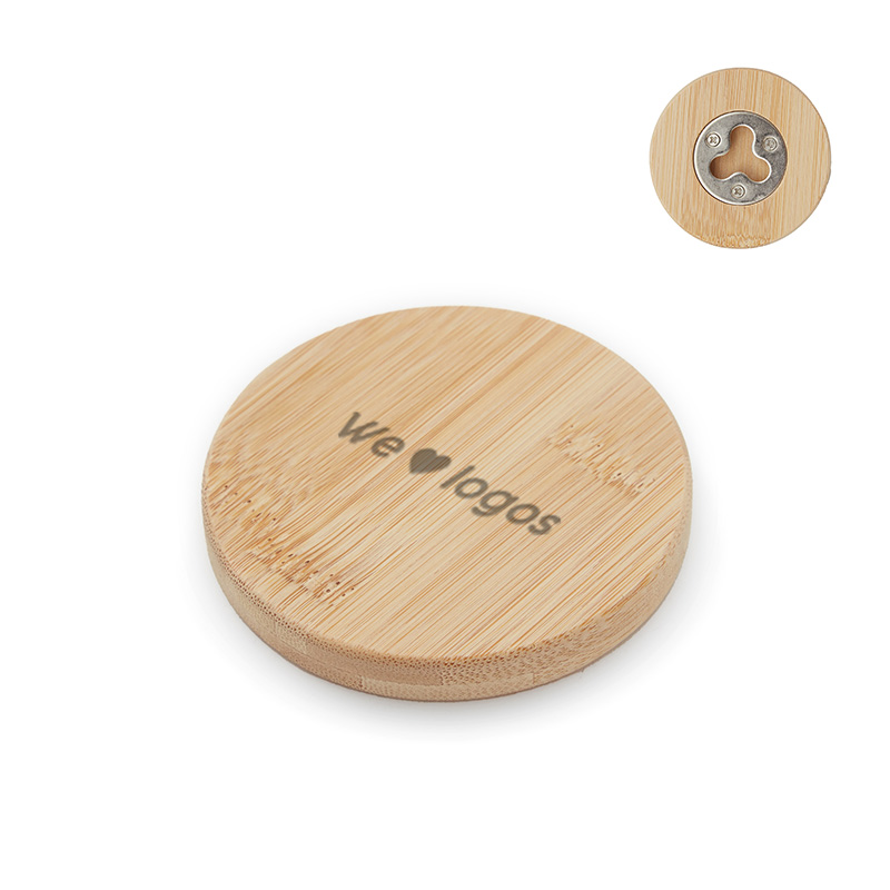 Destapador abrebotellas circular fabricado en bambú y metal. Dimensiones: 6 cm. ReUseMe.
