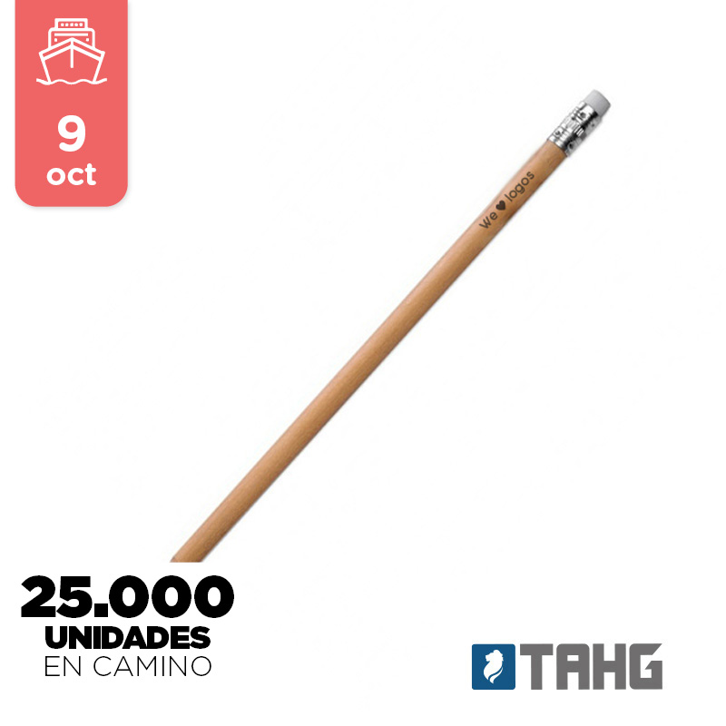 Lápiz grafito con goma. Realizado en madera con detalle de aluminio en reborde de goma. Material de la goma: Caucho. Punta sin preafilar. Medidas: 189 mm x Diámetro 0,8 mm. Mina: 2mm.