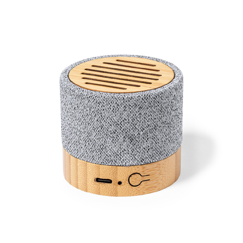 Parlante portátil fabricado en bambú y RPET. Tiene tecnología Bluetooth 5.0 y una batería de 300 mAh. Ofrece de 2 a 4 horas de reproducción con una carga de 2.5 horas. El parlante viene dentro de una caja de cartón junto a su manual de instrucciones y cable cargador. Dimensiones: 5,4 x 6,05 cm. Reuseme. Incluye Gift Box confeccionada en cartulina Kraft.