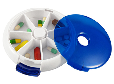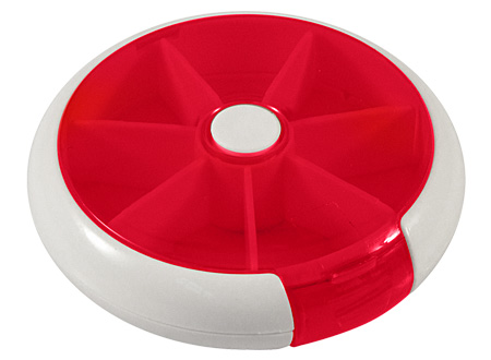 Pastillero Redondo con 7 compartimentos para cada día de la semana. Dispensador automático giratorio. Cubierta de color traslúcido.