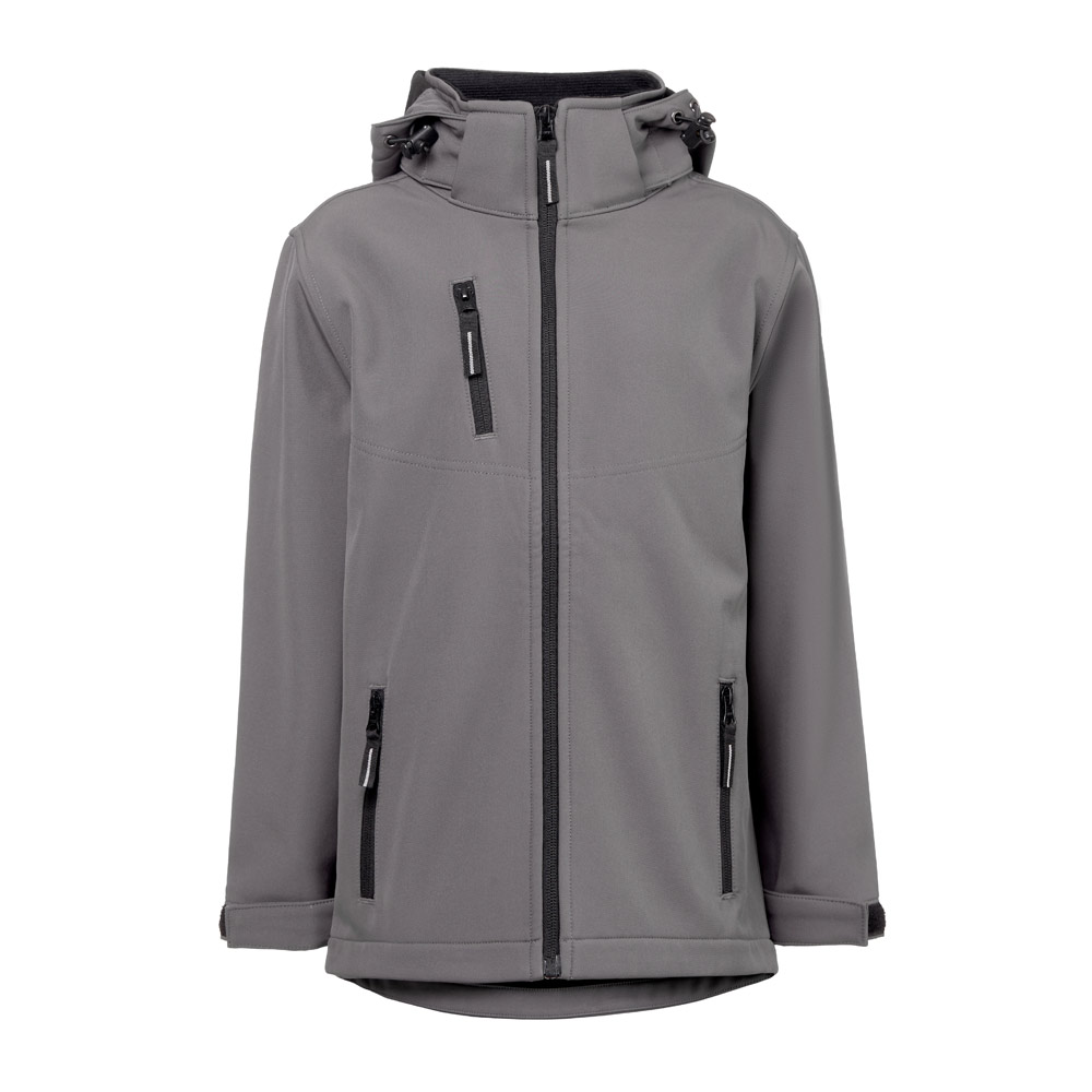 Chaqueta para niño en softshell 96% poliéster reciclado y 4% elastano (280 g/m²), con dos cordones y forro resistente al agua. Chaqueta forrada en polar (100% poliéster reciclado) con 2 bolsillos delanteros y un bolsillo diagonal en el pecho, ambos con cremallera. Capucha desmontable y ajustable con cordón y cinta adhesiva con cremallera para ajustarse al cuello. Apertura frontal con cremallera YKK®: una marca que utiliza equipos modernos y control de alta calidad. Puños ajustables con tira de cierre adhesivo. Espalda baja redondeada. Tamaños: 4, 6, 8, 10, 12